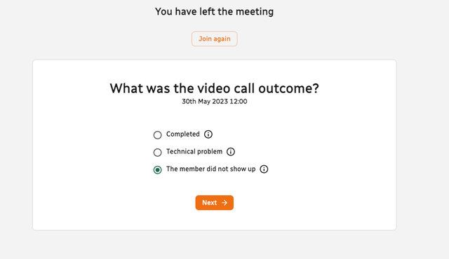 Mark the call “The member did not show up” and click next.