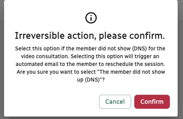 Confirm that this is the action you want to take and click confirm. This will trigger an automated email to the member asking them to reschedule the appointment. A new booking prompt will appear in the app. For most programmes, members are allowed 2 DNS before being discharged from the programme.