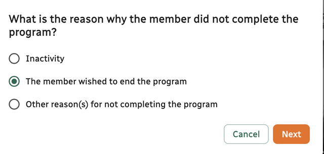If the user does not reply again and stops engaging in the app, or confirms that they would like to leave the programme, send a final intervention message that summarises what’s been achieved, wishes the member well, and confirms that you will end the programme for them. Then take the following steps: